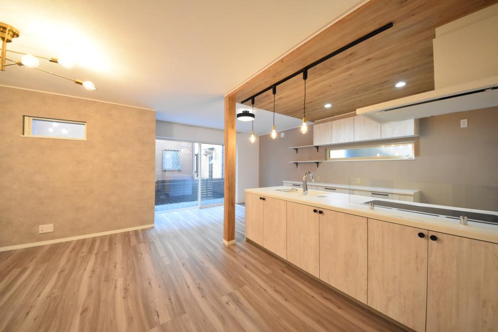内装は明るい木目とこだわりのアクセントクロスを入れた、好きが詰まった空間となりました。