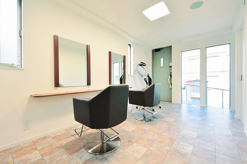 1階は美容室、居住スペースは色使いに遊び心のある3階建て
